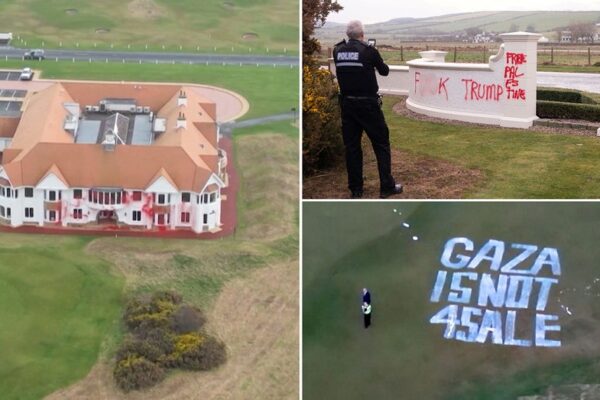 President Donald Trump’s highly acclaimed Turnberry golf resort in Scotland was vandalized with graffiti overnight Friday by pro-Palestine activists who also dug holes into one of the course’s fairways. Drone footage shows the resort’s clubhouse splattered with red paint while giant white letters reading “Gaza Is Not For Sale” were painted on an area next…
